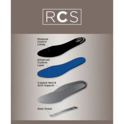 - Moisture-wicking RCS footbed system with heel and arch support and double cushioning layer for great comfort